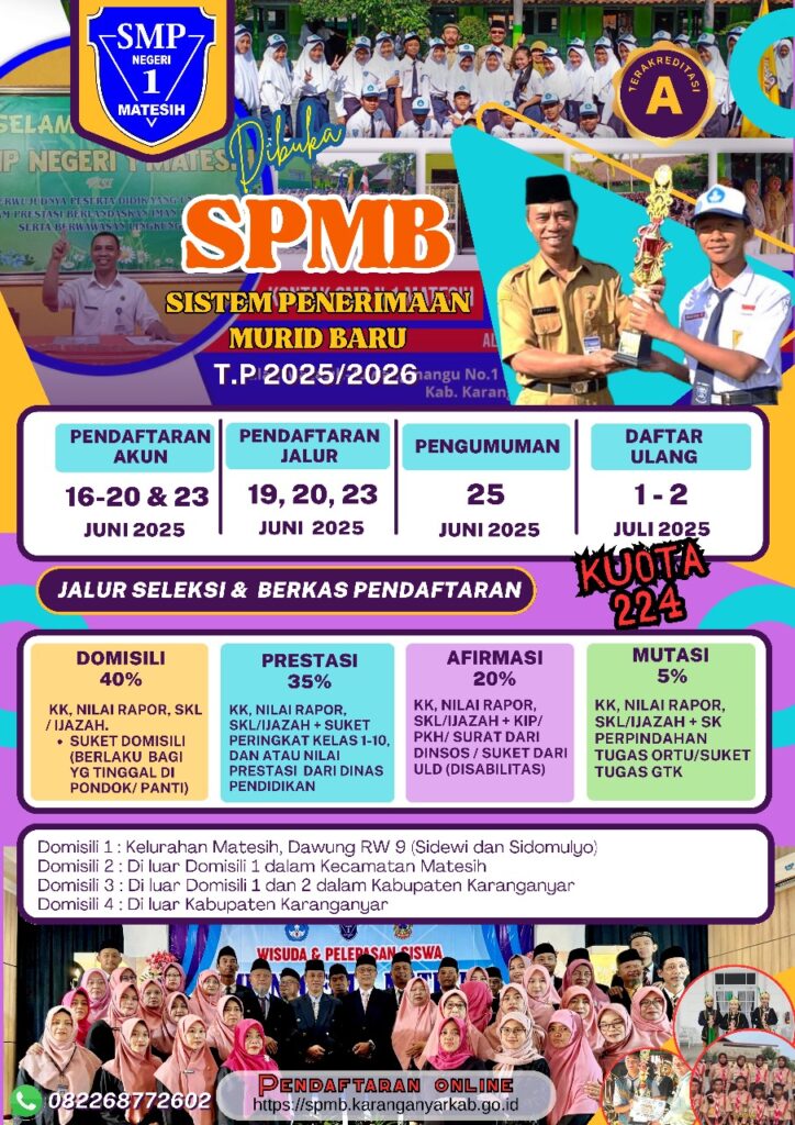 - Jurnal harian dan pengumuman hasil PPDB dapat dilihat langsung pada papan pengumuman di Satuan Pendidikan yang bersangkutan atau melalui website www.smpn1matesih.sch.id ;